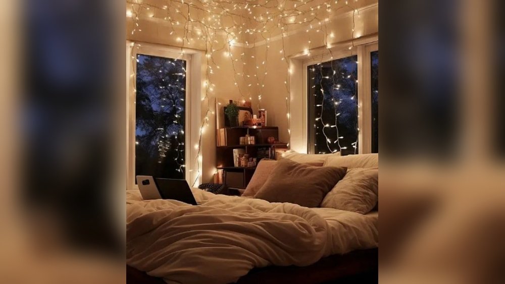 If you have a large window or a blank wall, curtain fairy lights can make the space look dreamy and elegant. These are especially popular as backdrops for parties or video calls.
